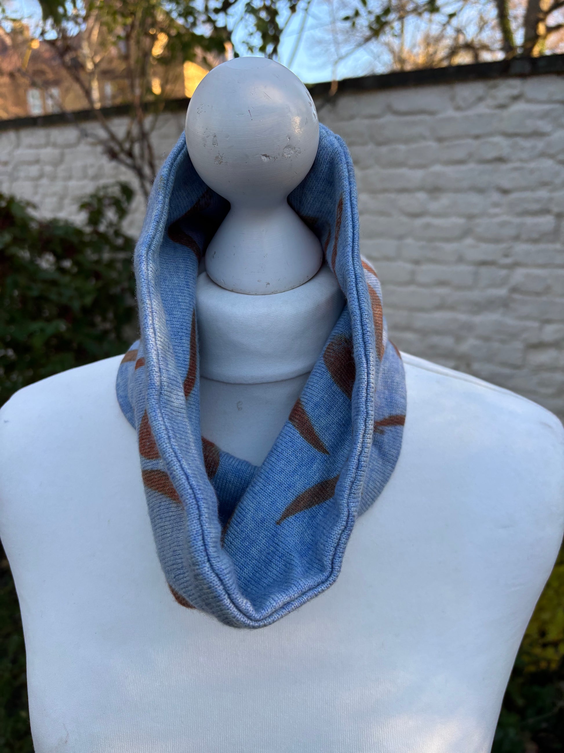 Luxurious neckwarmer hand made with upcycled knitted sweater fabric. The outer and inner layers of blue merino and cashmere fabric is botanically ecoprinted by hand with Eucalyptus Nicholli and Cordata from my garden..